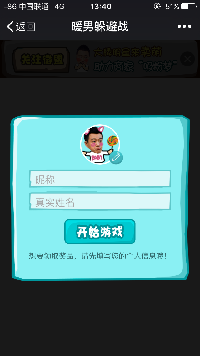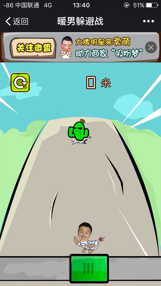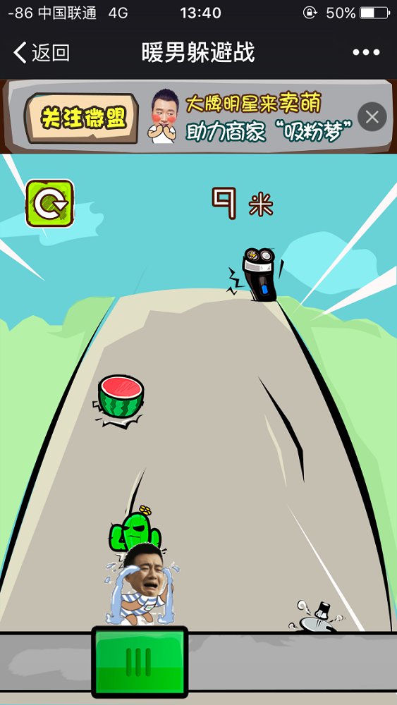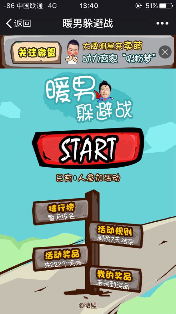 暖男躲避战是与《我的早更女友》电影发行方强强联手,联袂带来的一款有趣搞笑的活动,通过明星效应,带来病毒式传播,参与活动的粉丝在游戏中躲避的障碍物越多,成绩越好,活动结束后,根据排名派发奖品,另外,粉丝在游戏中还能获得幸运奖,并且通过分享朋友圈能提高中奖概率,这样会引起大量粉丝关注,刷屏朋友圈;