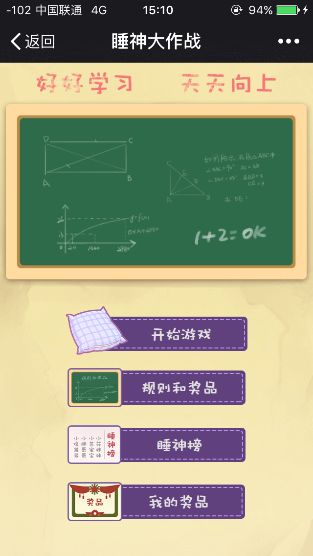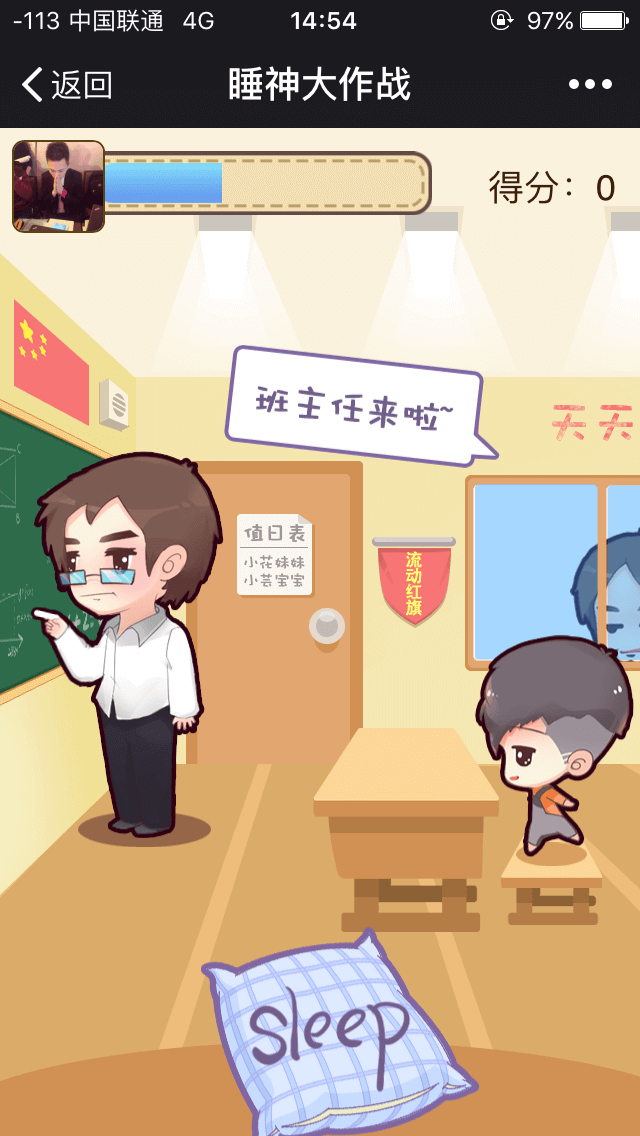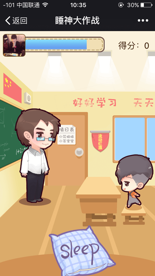 课堂情景的排行榜性质小游戏,粉丝在游戏中通过连续点击睡觉按钮进入睡眠状态,睡眠过程中,不能被老师发现,否则游戏结束。睡眠时间越长,得分越高,活动结束后,商户可按照排行榜排名派发奖品。
