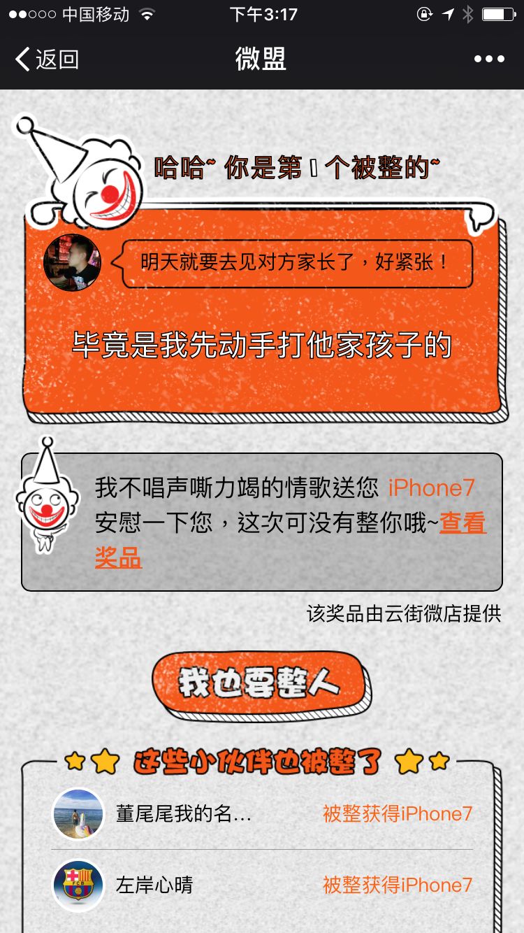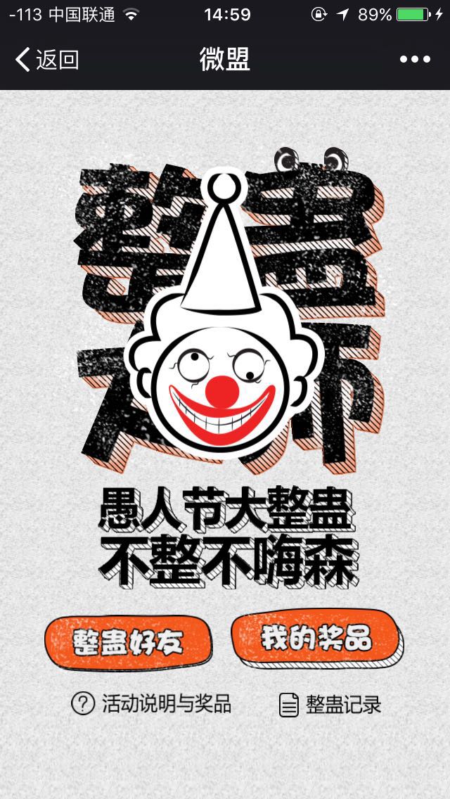 活动利用标题党形式,通过幽默搞笑的内容激发粉丝分享转发;粉丝进入游戏页面后,选择喜欢的整蛊内容(整蛊内容包含整蛊标题和整蛊真相),分享朋友圈或者转发给好友后,粉丝的好友只能看到整蛊标题,点击该链接后会看到整蛊真相,此时该好友即被整蛊,好友被整蛊同时,有机会获得奖品。