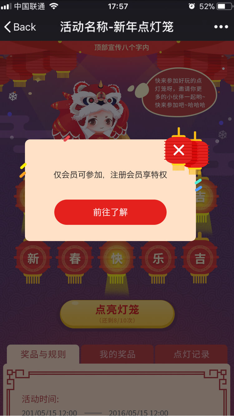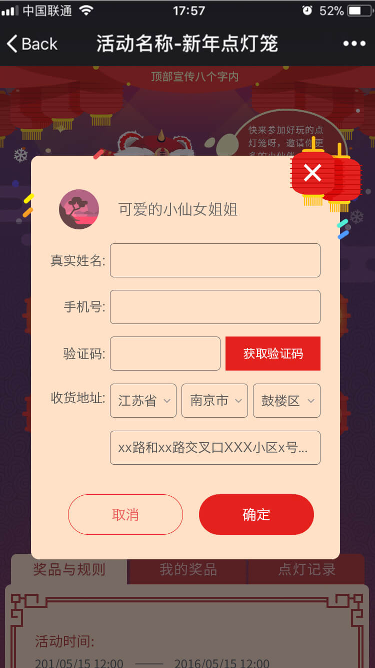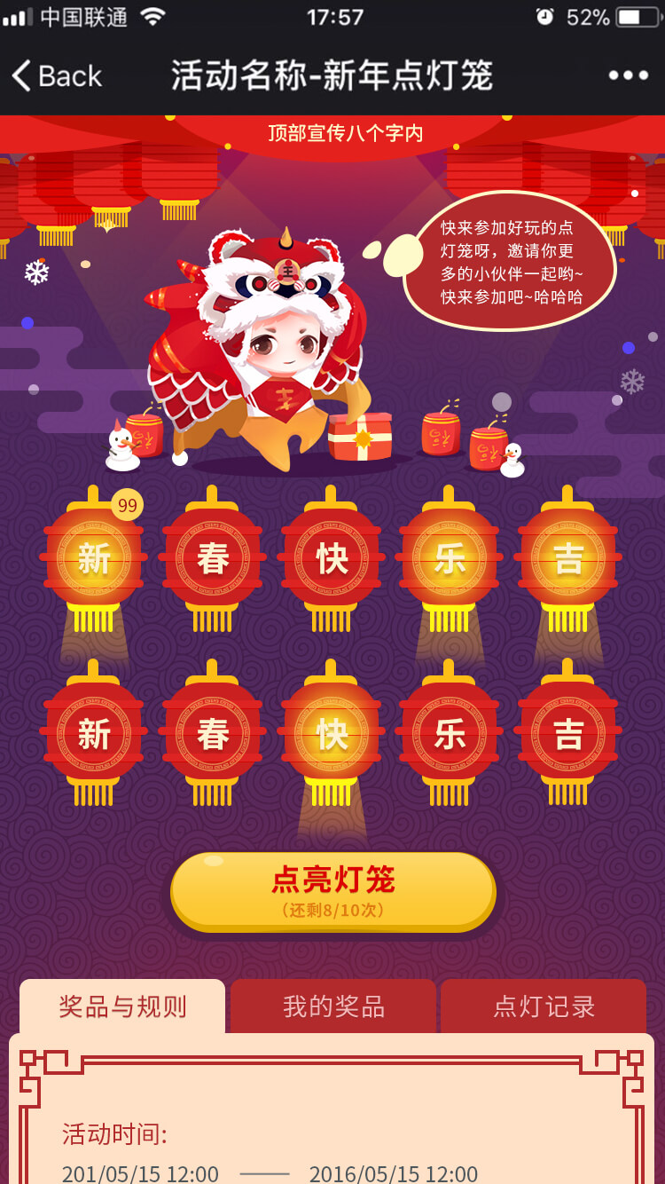 粉丝通过邀请好友来点亮灯笼,当达到礼物兑换规则时就可兑换相应礼物。商家可设置多种类型的活动礼物,包括实物礼物、会员奖励、优惠券、微信红包,适应多种营销场景。